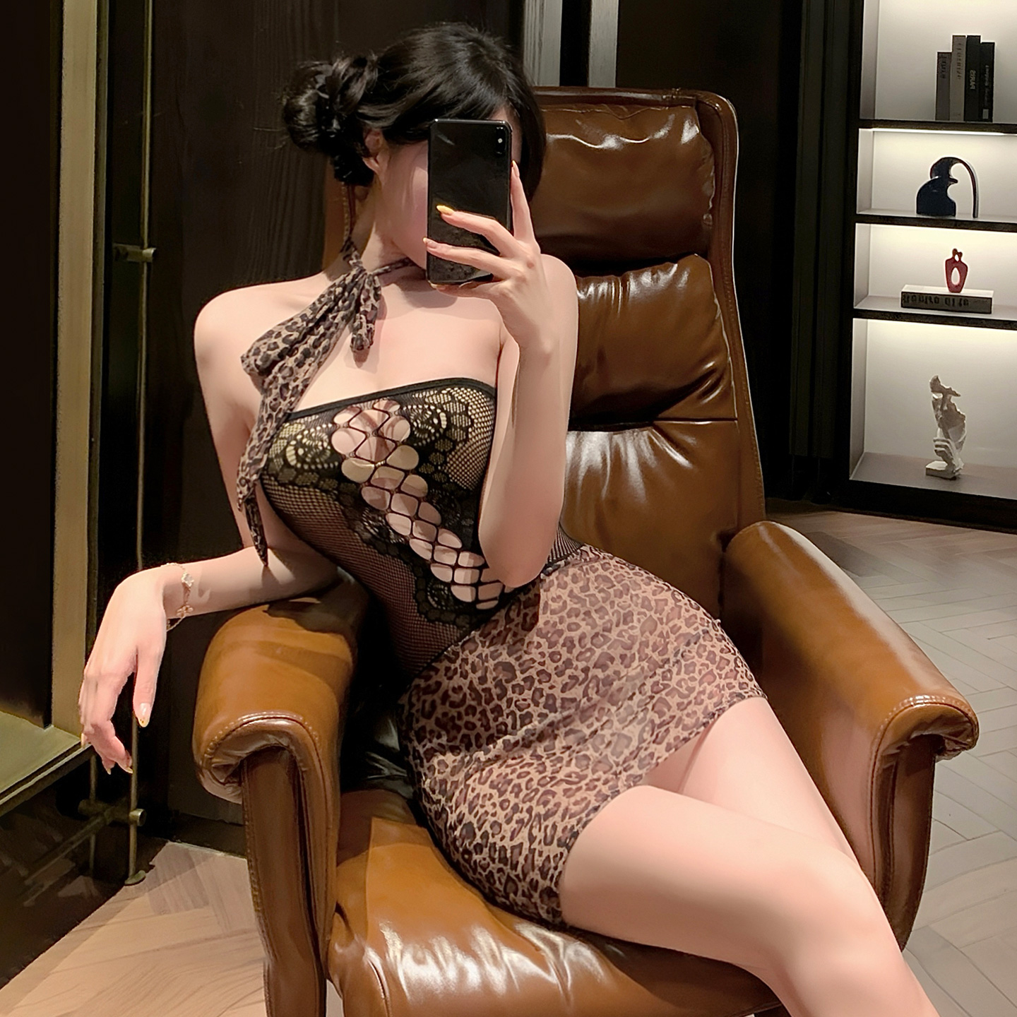 Leopard Cutout Open-Bust Mesh Uniform Dress Leopard Cutout Open-Bust Mesh Uniform Dress