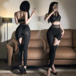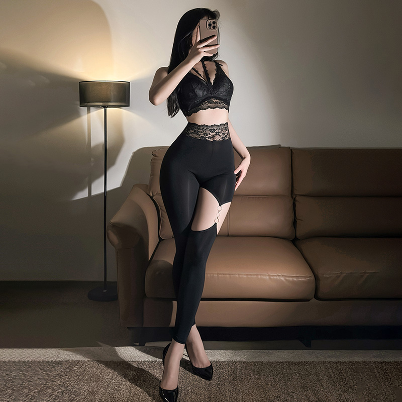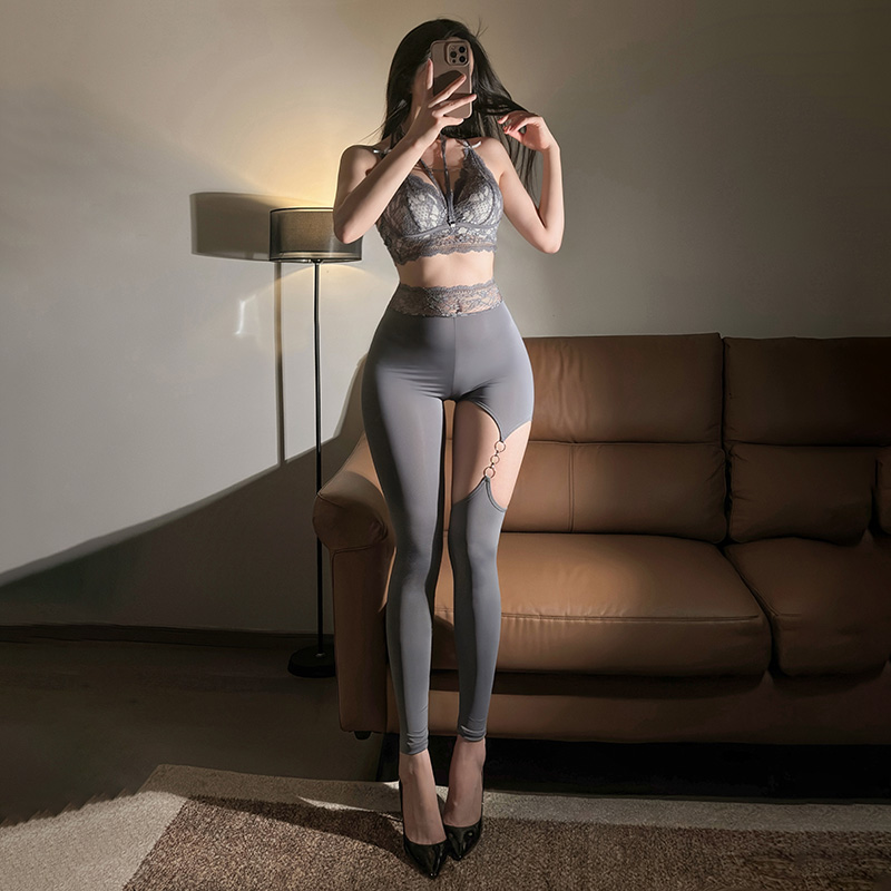 This two-piece set blends soft, everyday comfort with a flirty, modern edge. The underwire cotton bra offers gentle support and a natural lift, making it perfect as a base layer or worn on its own. Paired with high-stretch yoga pants featuring lace trim, cutout details, and a bold ring accent, this set turns a simple outfit into a confident statement.